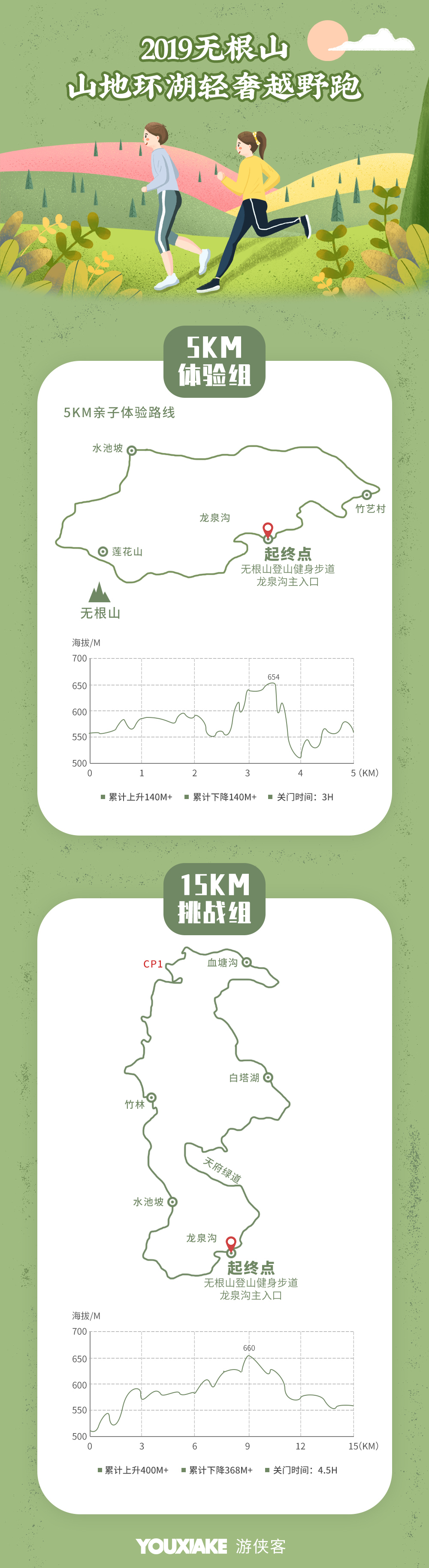 2019無(wú)根山山地環(huán)湖輕奢越野跑定于4月27日在無(wú)根山旅游景區(qū)舉行,起終點(diǎn)均設(shè)在無(wú)根山登山健身步道龍泉溝主入口。賽道全程15KM,比賽設(shè)項(xiàng):5KM親子體驗(yàn)組,15KM成人挑戰(zhàn)組。無(wú)根山環(huán)湖輕奢越野跑是體育與旅游深度結(jié)合的產(chǎn)物,以賽事為媒介,深度結(jié)合無(wú)根山自然環(huán)境、人文景觀,將無(wú)根山優(yōu)越的越野文化推介給廣大運(yùn)動(dòng)愛(ài)好者。我們強(qiáng)調(diào)回歸山林,感受自然,健康越野,體驗(yàn)熱血。游俠客也將繼續(xù)以賽事體驗(yàn)為核心,不斷提升服務(wù)質(zhì)量,賽事水準(zhǔn),開(kāi)發(fā)優(yōu)質(zhì)的輕奢越野跑賽事。