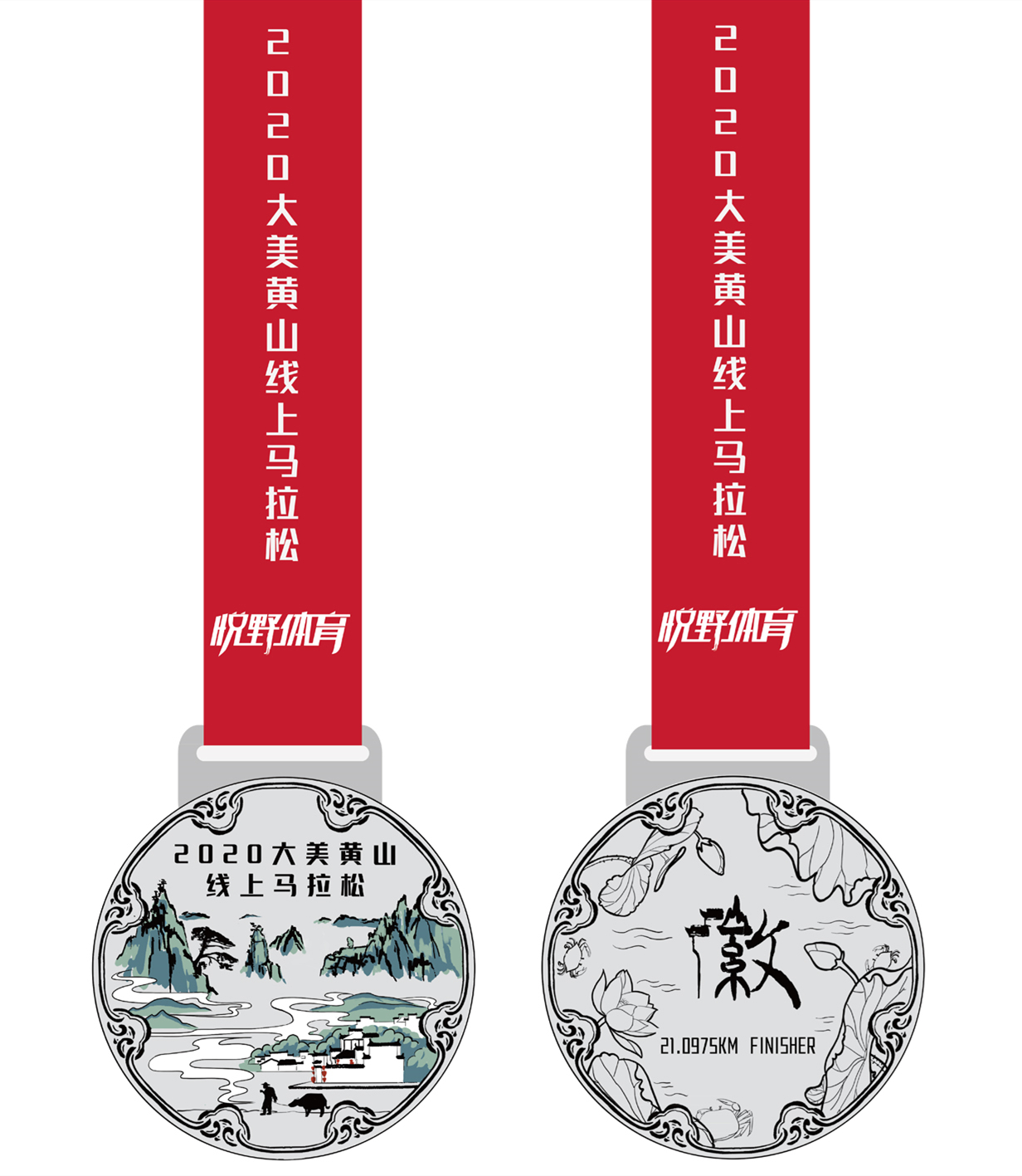 完賽紀(jì)念獎(jiǎng)牌效果圖(獎(jiǎng)牌整體仿照徽州三雕之一的磚雕做外形,正面取大美黃山和絕美徽州畫(huà)里鄉(xiāng)村的意象,就像一幅水墨畫(huà),獎(jiǎng)牌背面以“徽”為主視覺(jué),解構(gòu)“徽”字,其實(shí)它是由“山”、“水”、“人”、“文”四字構(gòu)成,這四字共同組成了風(fēng)采多姿的徽州。外圈荷花和螃蟹的組成,生動(dòng)有趣,也意寓“和諧”。)