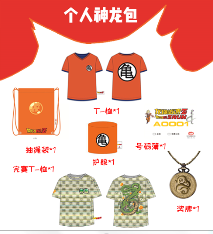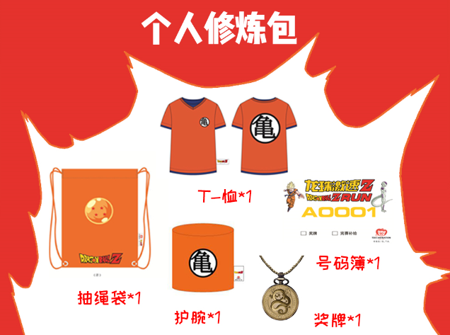 賽事T恤2件,號碼簿2個,抽繩帶1個,護腕1個,鑰匙扣1個,仙豆袋1個,完賽獎牌2塊(獎牌當天完賽后領?。?/span>