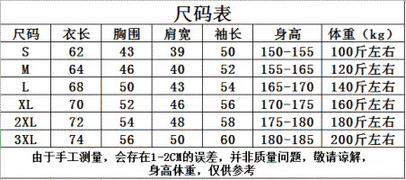 11,衣服尺碼對照表: