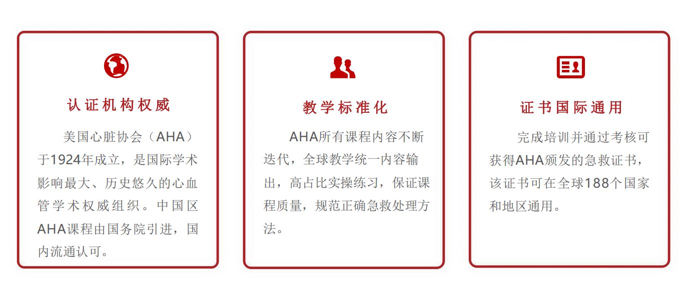 AHA官方授權(quán)培訓(xùn)中心,連續(xù)3年蟬聯(lián)中華區(qū)銀獎(jiǎng),目前全國(guó)各城市直屬培訓(xùn)點(diǎn)50余個(gè),針對(duì)普通大眾主推拯救心臟(Heart saver)課程,針對(duì)醫(yī)務(wù)從業(yè)者基礎(chǔ)生命課程(BLS),以及對(duì)應(yīng)導(dǎo)師課程,每月以社招課形式服務(wù)于普通個(gè)人,同時(shí)支持團(tuán)體/企業(yè)定制上門培訓(xùn)服務(wù)。