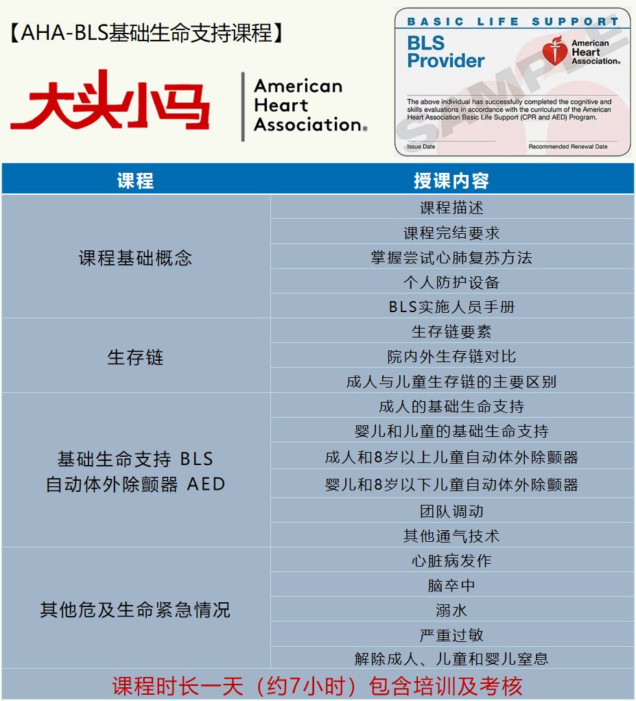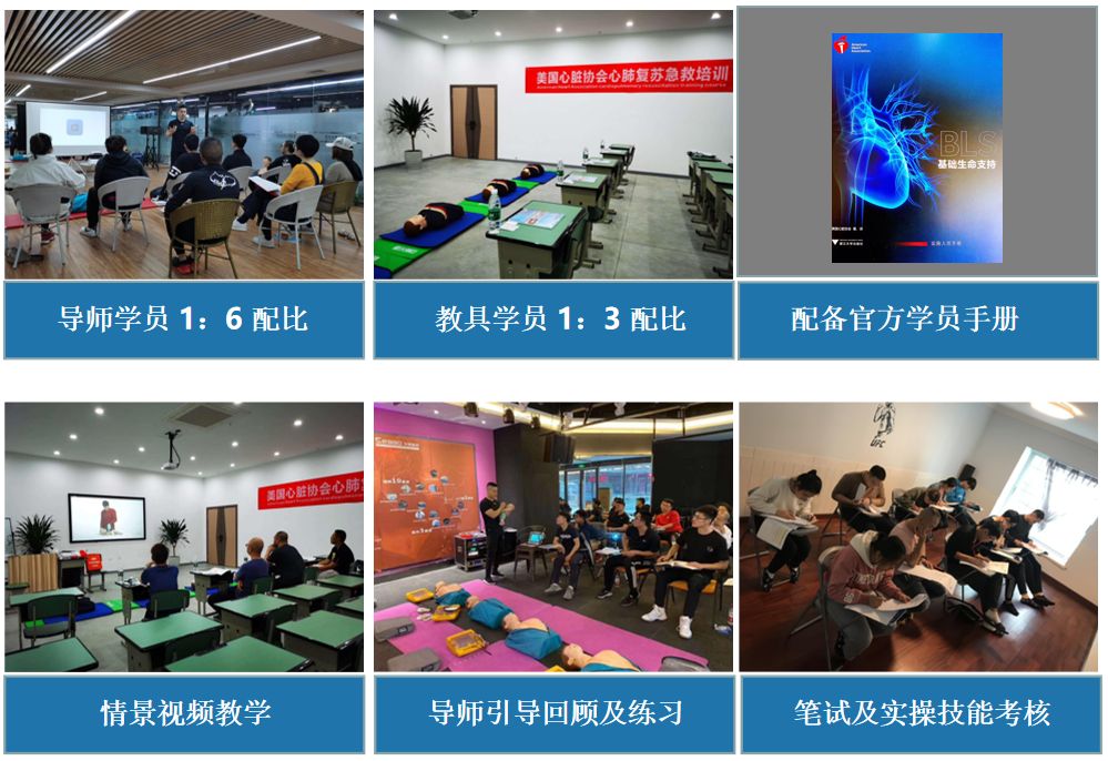 AHA的BLS(基礎(chǔ)生命支持)培訓(xùn),全中文授課,全天約7小時(shí)的課程中學(xué)員將掌握高效的CPR操作及AED使用,團(tuán)隊(duì)協(xié)同救治。