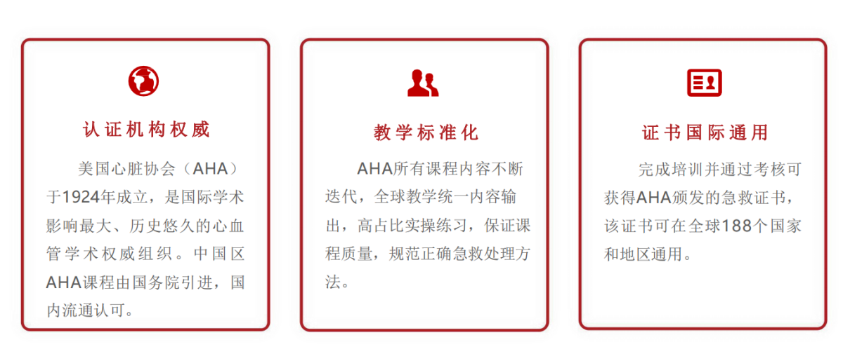 AHA官方授權(quán)培訓(xùn)中心,連續(xù)5年蟬聯(lián)中華區(qū)銀獎(jiǎng),目前全國各城市直屬培訓(xùn)點(diǎn)70余個(gè),針對普通大眾主推拯救心臟(Heart saver)課程,針對醫(yī)務(wù)從業(yè)者基礎(chǔ)生命課程(BLS),以及對應(yīng)導(dǎo)師課程,每月以社招課形式服務(wù)于普通個(gè)人,同時(shí)支持團(tuán)體/企業(yè)定制上門培訓(xùn)服務(wù)。